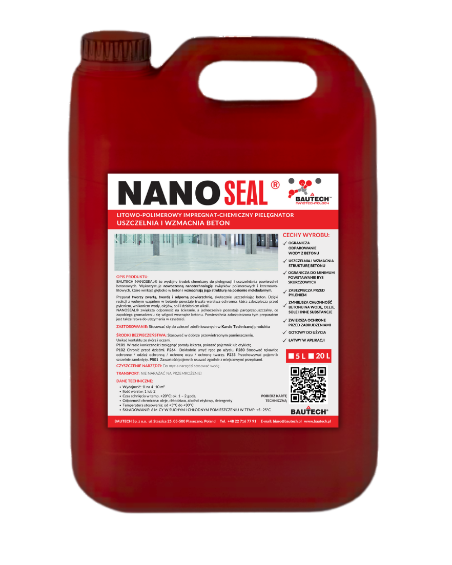 BAUTECH NANOSEAL™ - это высокоэффективное, химическое средство по уходу за поверхностью и герметик для бетонных поверхностей. Новейшая технология, использующая элементы НАНОТЕХНОЛОГИИ составов полимерных и литиевых с высокими показателями силикатного модуля. Благодаря проникновению и твердению бетона в молекулярной структуре, позволяет получить высокопрочную цементную матрицу с экстремальными физическими и химическими свойствами. Избирательно подобранными полимерными связующими обеспечивает максимальное уплотнение.